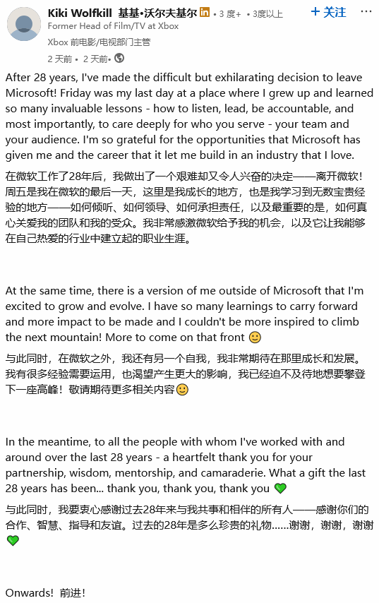 她写道:“我非常感激微软给予我的所有机会,让我能够在自己热爱的行业中建立起职业生涯。”