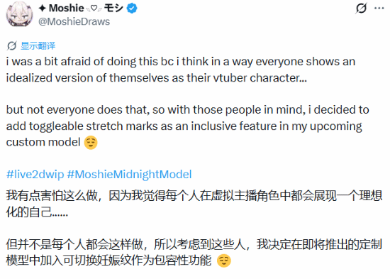 MoshieDraws表示,她最初对这一设计有些顾虑,因为多数VTuber角色都会呈现理想化的身体形象。但她认为,并非所有人都认同这种单一审美,为了让更多用户能在虚拟形象中找到共鸣,她决定加入这一包容性选项。