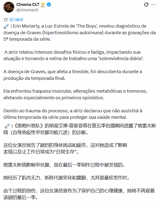 近日,据cinemaclt报道,在《黑袍纠察队》中饰演“星光”的女演员艾琳·莫里亚蒂(Erin Moriarty),在第五季拍摄期间确诊格雷夫斯病(自身免疫性甲状腺功能亢进症)。