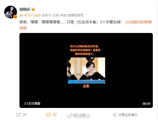 4月22日,刘晓庆在社交平台转发了一条标题为《为什么刘晓庆私生活丰富,但是风评仍然很好?看看她做的你就知道了》的视频,配文先是俏皮致谢“谢谢”,随后认真纠正:“嘿嘿,嘿嘿嘿嘿嘿…,只是(私生活丰富)5个字要去掉!”