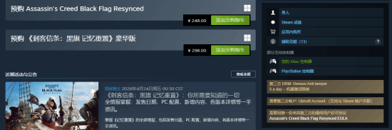 《刺客信条:黑旗 记忆重置》是育碧对2013年经典之作《刺客信条4:黑旗》的一次现代重制,育碧现已官宣本作将于7月9日正式发售,支持中配,Steam国区售价248元。