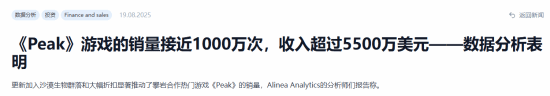 而《PEAK》在2025年6月17日发布,而在2025年8月19日时本作销量就已售出接近千万份。