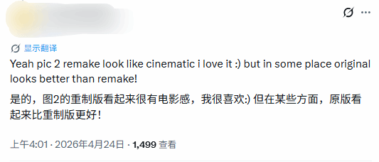 而一位游戏圈博主发文反驳这些说法:自己看看重制版的提升到底有多疯狂(insane)!并选取了一组对比十分显著的同一景观。