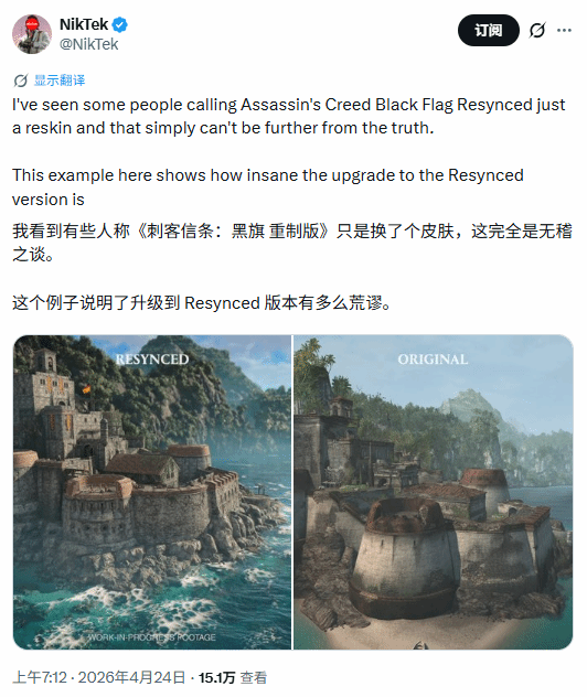游戏资讯 · 2026年4月24日 — 今日《刺客信条:黑旗 记忆重置》正式公布新片,而玩家群体对其的讨论热度高涨。 有不少玩家指出:《黑旗RE》的画面相比原版就是在原地踏步! 而一位游戏圈博主发文反