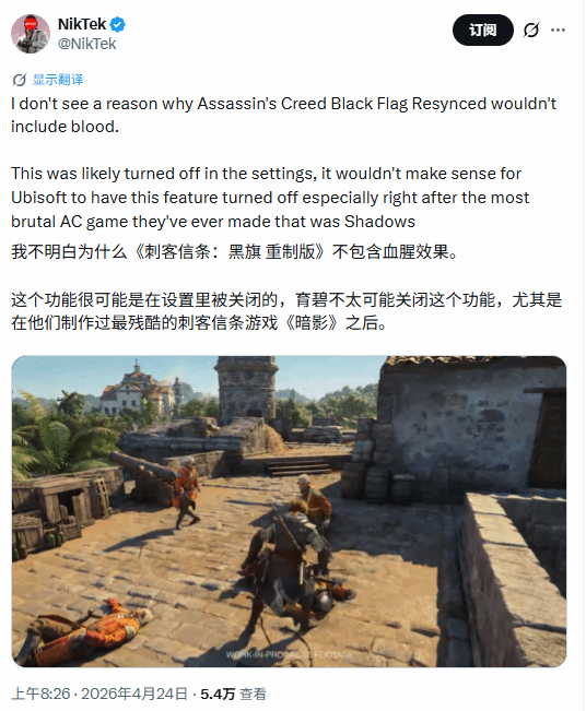 但博主表示,育碧和谐整个游戏的可能性几乎为0,因此很可能只是在设置选项中禁用了血腥效果。