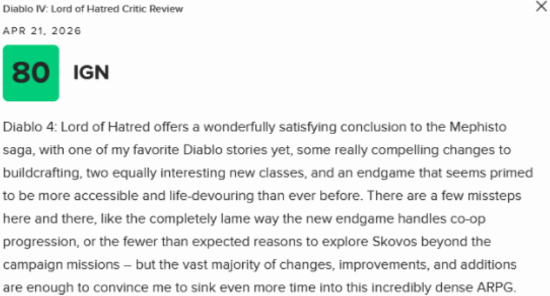 近日,各大游戏媒体的评分正式解禁。IGN给予本资料片8分评价,认为这是一款“内容丰富、剧情扎实”的扩展包。IGN编辑在评测中指出,《暗黑4》首个大型剧情篇章迎来了一个“富有情感张力与叙事完成度”的结尾,甚至是“系列中最具沉浸感的剧情篇章之一”。