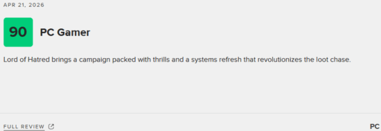 除了故事,游戏性方面也没有落下。评测者认为新增的两大职业风格鲜明、机制自洽,而终局内容虽然降低了门槛,但依然极具“时间吞噬力”。PC Gamer给出了高达90分的评价,称其“重塑了玩家长期游玩的动力循环”。