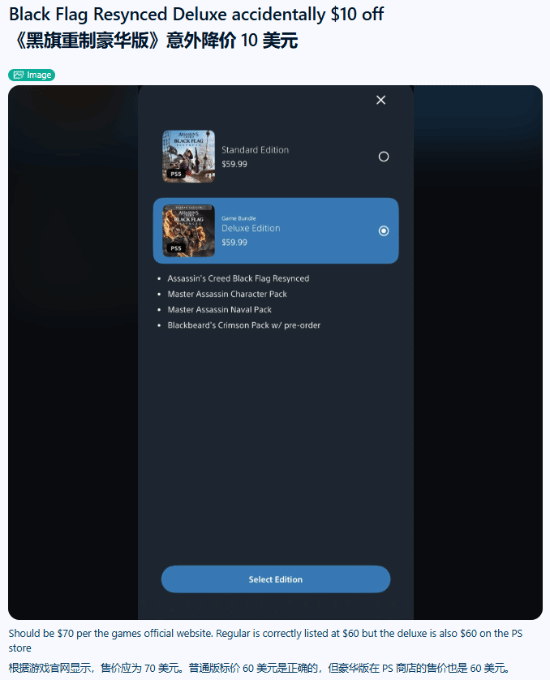 海外r/playstation社区曝出价格异常问题,《刺客信条:黑旗 记忆重置》在PS商店出现标价失误。游戏官网标定豪华版原价70美元,平台普通版稳定售价60美元,出错的豪华版临时同价售卖,直接便宜10美元。