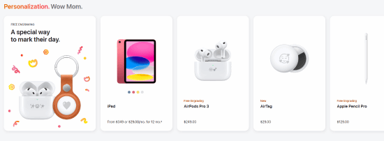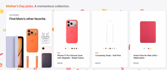 苹果官网商店迎来母亲节专属页面大改版,整体界面全面焕新,多款新品同步上架,节日送礼氛围直接拉满。 商店地址>> 本次更新页面增设母亲节专属精选专区,定制表带、保护壳、周边配件等单品风格温柔雅致,同时提供免费镌刻服务,赋予专属仪式感。平台以旧换新、灵活分期、极速配送等配套服务齐全,送礼选购省心又体面。