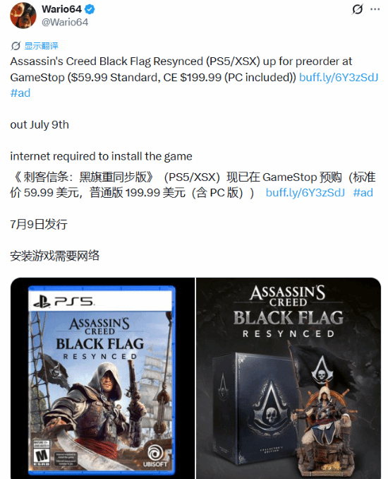 版本更新 · 2026年4月24日 — 育碧近日正式开启了《刺客信条:黑旗 记忆重置》(Assassin’s Creed Black Flag Resynced)的预购通道。 但据知名爆料人Wario