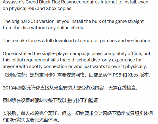 育碧近日正式开启了《刺客信条:黑旗 记忆重置》(Assassin’s Creed Black Flag Resynced)的预购通道。 但据知名爆料人Wario64透露,《刺客信条:黑旗 记忆重置》的PS5/Xbox实体盘版本安装阶段必须联网验证,强制下载完整补丁包与验证文件。 本作无法像原版那样直