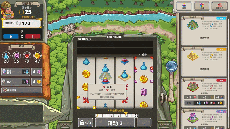每一次拉动拉杆,都是文明命运齿轮的一次转动。看着老虎机上的符号随机落下,收获资源,或是触发特殊事件。但核心的驱动在于“连线得分”——你需要将相同的资源、科技或军事符号巧妙地连成一线,不同的连线形状(如横线、竖线、对角线)将转化为推动时代发展的关键积分。