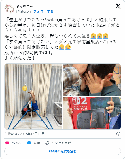 这位父亲格外看重承诺。他儿时常常遭遇长辈许诺后反悔的情况,落空的心愿让他记忆犹新。他不想让孩子承受同样的失落,决心用实际行动守住约定。孩子成功当天,他立刻驱车赶往家电卖场,彼时Switch2货源紧缺,线下购入难度极高。