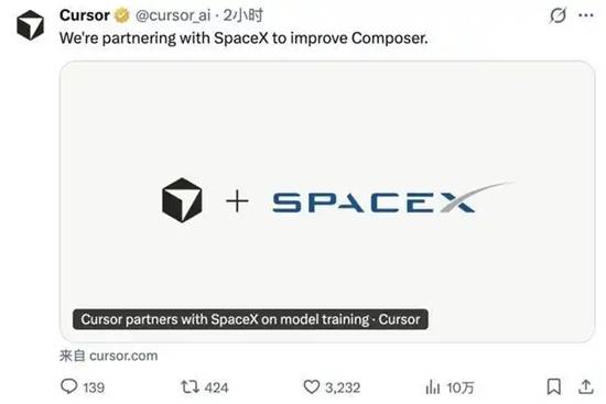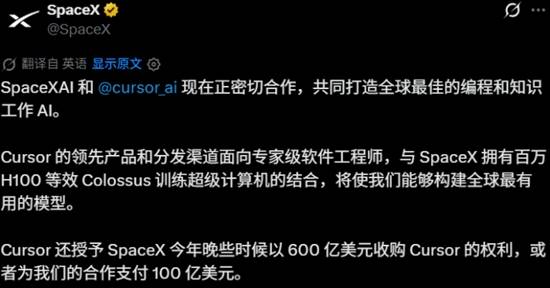 近日,马斯克旗下的SpaceX在X平台上宣布,已与AI编程初创公司Cursor达成协议,获得在今年晚些时候以600亿美元收购Cursor的权利,或为双方正在进行的合作项目支付100亿美元。