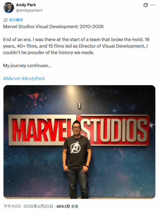 他写道:“漫威影业视觉开发部:2010-2026,一个时代的终结。我亲历了一支打破常规的团队从零起步的全过程。16年、40余部电影、15部以视觉开发总监身份主导,对我们共同创造的历史无比自豪。”