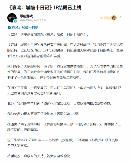 昨日,零创官方发文,针对广大玩家对游戏剧情以及结局的争议,官方制作了一条IF线结局,现已免费更新至游戏中。官方诚邀玩家体验为大家准备的充满希望和美好的新结局。