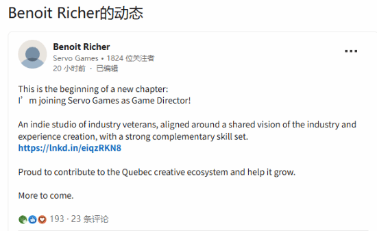 然而在一则新的 LinkedIn 动态中,Richer表示自己已经离开育碧,加入独立新工作室 Servo Games,也不再参与《女巫》的开发。而就在两个月前,本作的创意总监、曾参与《细胞分裂》系列的 Clint Hocking 也已离职。