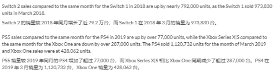 同比数据对比,Switch 2相较初代Switch同期销量多出79.2万台;PS5相较PS4同期小幅上涨7.7万台;而Xbox Series X|S相较Xbox One同期大幅下滑28.7万台。