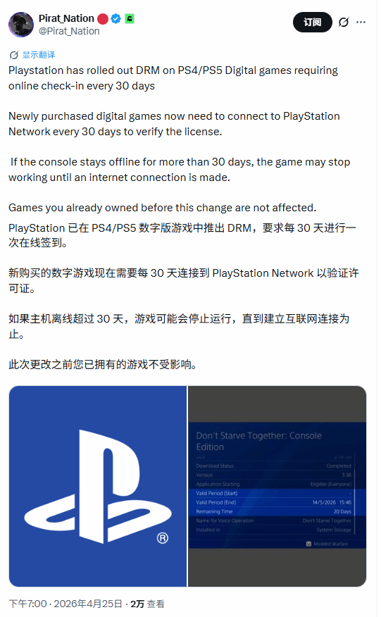 游戏资讯 · 2026年4月25日 — 据国外博主分享,目前PlayStation在PS4和PS5的数字版游戏中加入了DRM验证(正版在线验证)机制。 新购买的数字游戏需要每30天连接一次PS网络来验