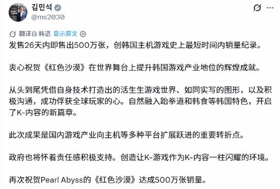 韩国总理金民锡近日在社交媒体上发文,盛赞Pearl Abyss开发的开放世界动作冒险游戏《红色沙漠》,称其“为K-Content(韩国文化内容)开启了新篇章”。该游戏发售不到一个月销量已突破500万份,创下韩国主机游戏史上最快达成该销量的纪录。