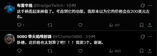 但也有玩家持相反看法,认为其性价比突出:“看起来是个很强的手柄,我原以为会接近200美元。”“这价格太值了,我能买三个!”