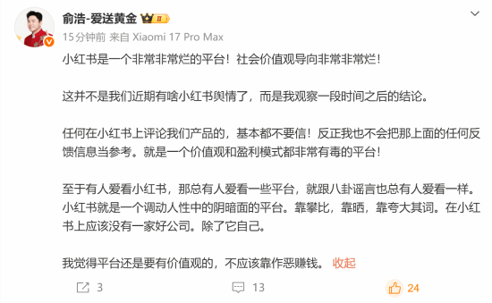 觅科技创始人兼CEO俞浩今日发文称,小红书是一个非常非常烂的平台,社会价值观导向非常烂。