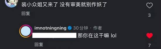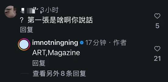 当有粉丝询问首张争议照片的含义时,宁宁直接用英文简洁回应“ART, Magazine(艺术、杂志)”,明确表明自己对照片的定位和立场。而面对一名网友语带讽刺的留言“你又怎么了大姐姐,两天沒说你,小众病又犯了是吧”,宁宁则毫不客气地回呛“你是誰,轮得到你说我嘛哈哈哈”,火力十足的回应瞬间引发热议。