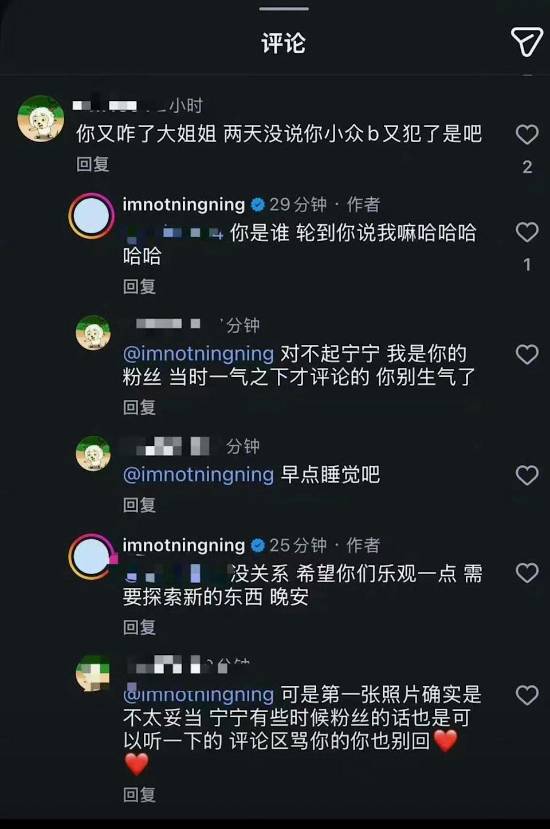 随后,该留言网友态度软化,向宁宁道歉称“对不起宁宁,我是你的粉丝,一气之下才评论的,你別生气了,早點睡吧”,宁宁则恢复平和语气回应“没关系,希望你們乐观一點,需要探索新的東西,晚安”,以高情商收尾这场争执。