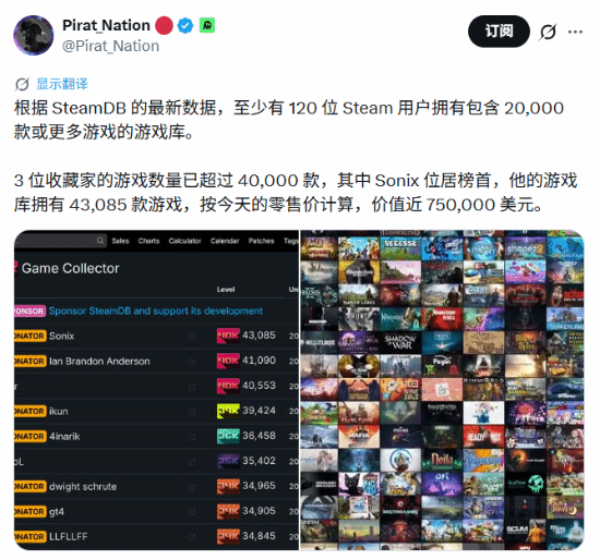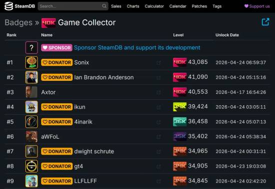 据悉,Steam收集榜以玩家账号内游戏数量为核心排名依据,“sonix”的收藏量远超榜单其他参与者,涵盖各类题材、各个年代的作品,被玩家称为“行走的游戏库”。值得一提的是,“sonix”来自中国上海,注册Steam已超15年,账号等级颇高,是公认的“Steam传奇收藏家”。早在2025年9月,他就率先突破4万款游戏收藏大关,成为全球唯一获得“Game Collector: 40,000+”徽章的玩家。目前其游戏库仍在持续扩张,实际包含近10万项产品(含DLC、 shovelware等),而该徽章仅统计高质量付费游戏,玩家称其为“行走的游戏库”。