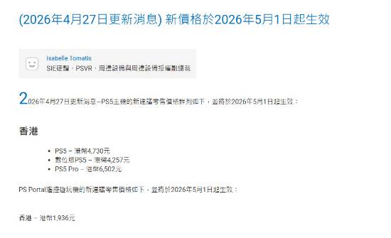PlayStation官方正式更新了香港地区PS5、PS5 Pro以及PlayStation Portal的价格调整公告。