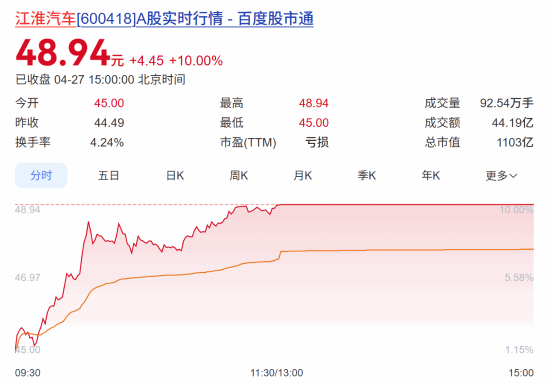 4月27日开盘,江淮汽车股价一路走高,盘中触及涨停,涨停价48.94元,涨幅10%,总市值达1103.19亿元。