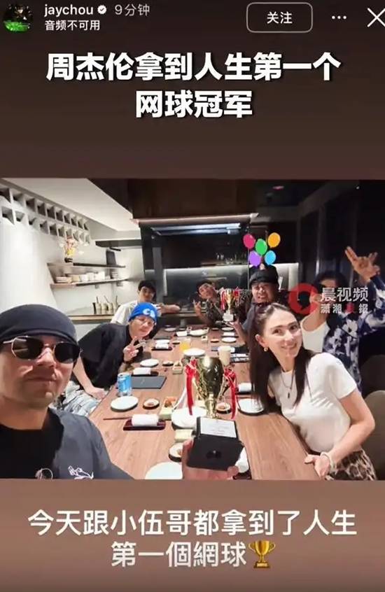 据中国新闻网报道,周杰伦晒图分享网球日常,配文“今天跟小伍哥都拿到了人生第一个网球奖杯”,同日,妻子昆凌晒合照庆祝,“听说有人今天拿冠军咯。”
