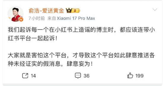 截至目前,小红书官方尚未对俞浩的系列言论作出正面回应。这场由知名车企或科技企业创始人发起的公开挑战,仍在大众舆论中持续发酵。