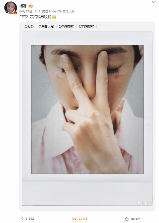 4月27日晚,知名女星杨幂在社交平台分享了一张近距离自拍照。杨幂配文称:“EP72: 蒸汽眼罩咬我”,显然是因蒸汽眼罩导致烧伤。
