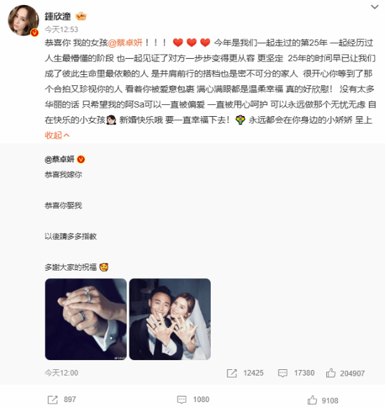 祝福并未聚焦婚礼细节,而是期许阿Sa余生被偏爱、被呵护,永远自在无忧,字里行间满是心疼与守护。文中点明同行第二十五年,结合Twins出道里程碑,让这份祝福沉淀浓厚岁月情怀。