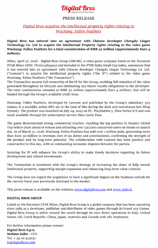 Digital Bros在公告中强调,迄今为止与灵泽科技的合作“一直是积极且富有建设性的”,双方之间不存在任何未解决的经济纠纷。此次收购旨在简化该IP未来的决策流程,使集团能够更灵活地制定续作、衍生作品及跨媒体发展的战略投资。