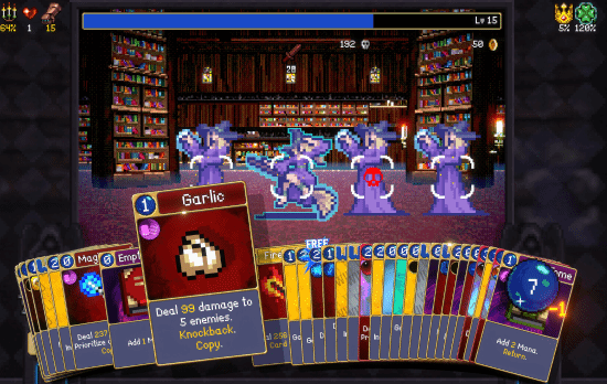 作为《吸血鬼幸存者》的首款衍生作品,本作并未简单复制原作的成功路径,而是将经典“割草”爽感转化为一套节奏飞快的回合制卡牌构筑玩法。玩家将带领幸存者小队,以第一人称视角探索迷宫般的地下城,通过法力消耗从小到大依次出牌触发“连击(Combo)”——每一步都会倍数放大下一张卡牌的效果,配合“万能牌(Wild Cards)”延长连击链,最终打出毁天灭地的指数级伤害。游戏保留了原作的核心元素,熟悉的武器、进化路线和角色均以卡牌形式回归,并为每一轮冒险提供了丰富的构筑可能性。