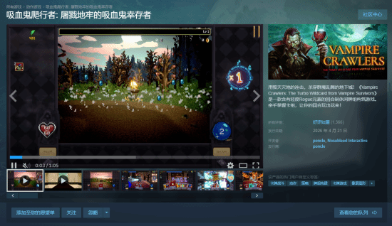 由《吸血鬼幸存者》开发商poncle与Nosebleed Interactive联合打造的衍生新作《吸血鬼爬行者:屠戮地牢的吸血鬼幸存者》已正式登陆 PC、PS5、Xbox Series X|S 及 Nintendo Switch 平台,Steam国区售价39元。游戏上线后迅速收获“好评如潮”口碑,在超过1800篇用户评测中好评率高达98%。