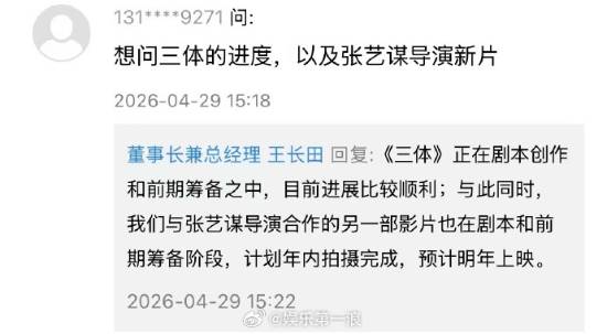 游戏资讯 · 2026年4月29日 — 2024年时我们曾报道,光线传媒董事长王长田在第26届上海国际电影节上宣布,由光线传媒与三体宇宙联合出品的电影《三体》确认由张艺谋执导。 今日,据微博@娱乐第一