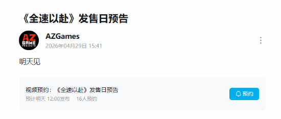 国内游戏制作人AZGames今日发布最新动态,带来新作《全速以赴》的进度汇报。制作人透露,将于明日正式公布本作的发售日相关预告。