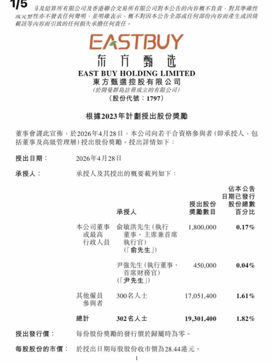 4月28日晚间,东方甄选发布公告,根据公司2023年股份激励计划,向公司董事、高级管理人员及核心员工授出共计1930.14万股股份奖励,涉及302人,占公司已发行股份的1.82%。以当日公司收盘价28.44港元/股计算,本次股份奖励总市值约为5.49亿港元,折合人民币约4.79亿元。
