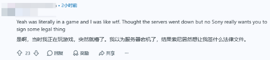 据Reddit网友反馈,就在几个小时之前,索尼向PS用户推送了全新的用户协议。然而值得注意的是,该推送会立刻中断任何正在进行的游戏或对局,强制将所有人踢下线,以阅读该协议。