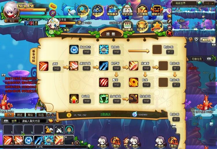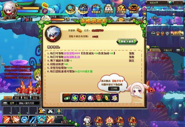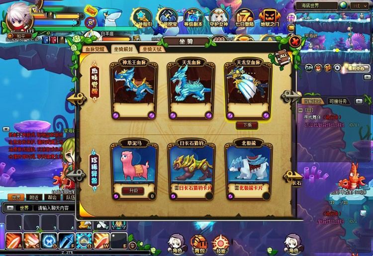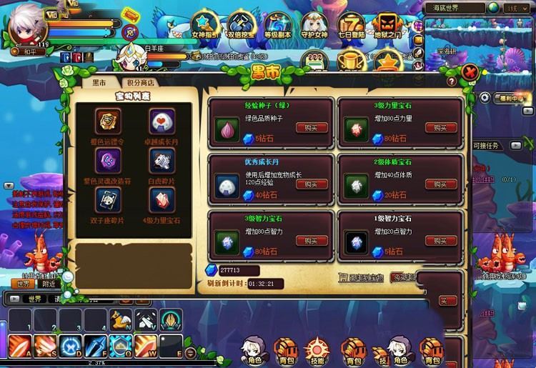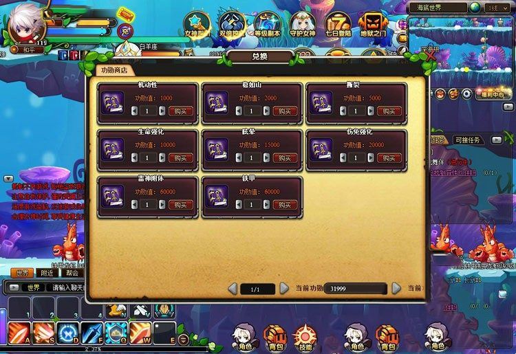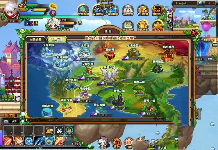 商城、守护女神、地下城副本、地狱之门、全民活动、自标指引、挖宝、种植勇者大会、狂欢派对、钓鱼、强化装备洗炼等。