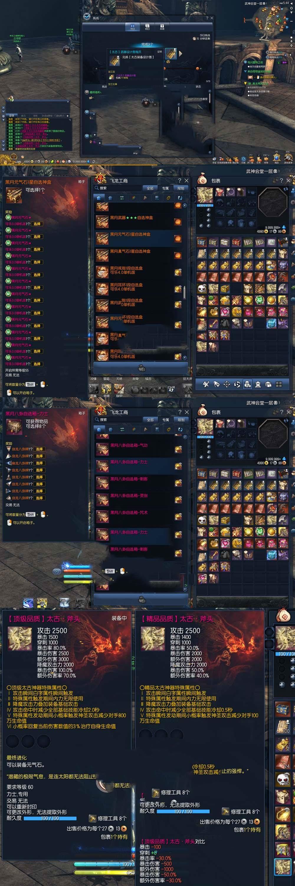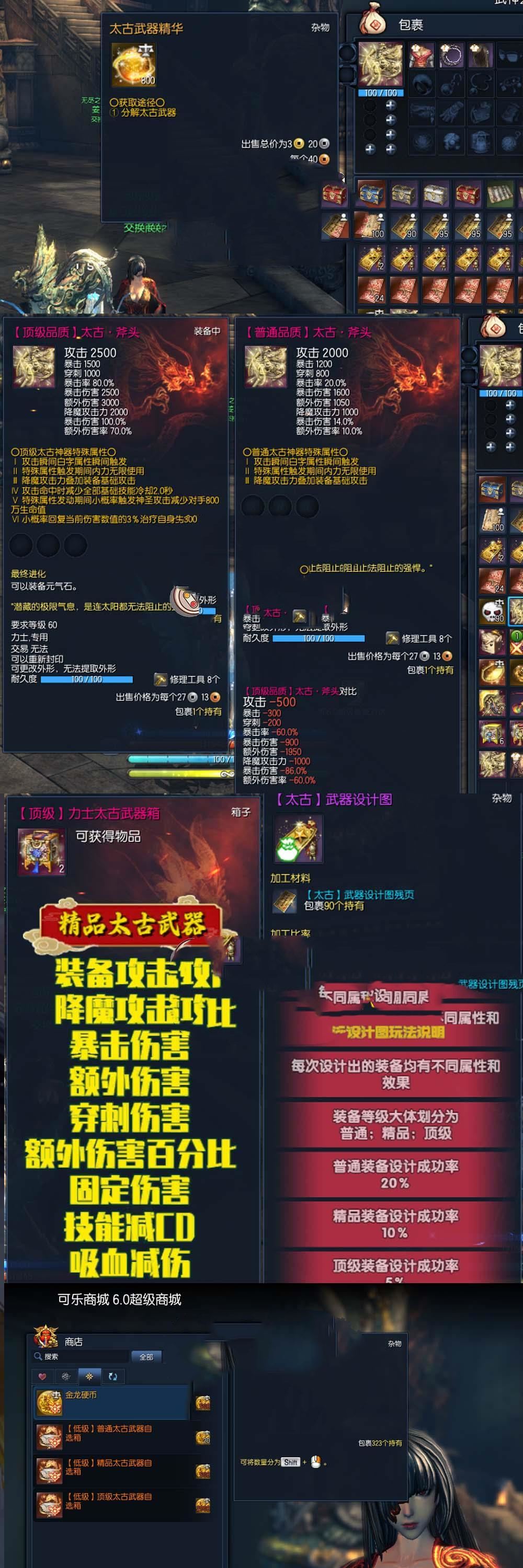 全新的武器命名为太古武器,太古武器摒弃了一切传统剑灵的玩法,采取设计图的方式进行升级。太古武器分为普通、精品、顶级。三种品级,每种品级下面细分为各种不同属性的实际武器属性。