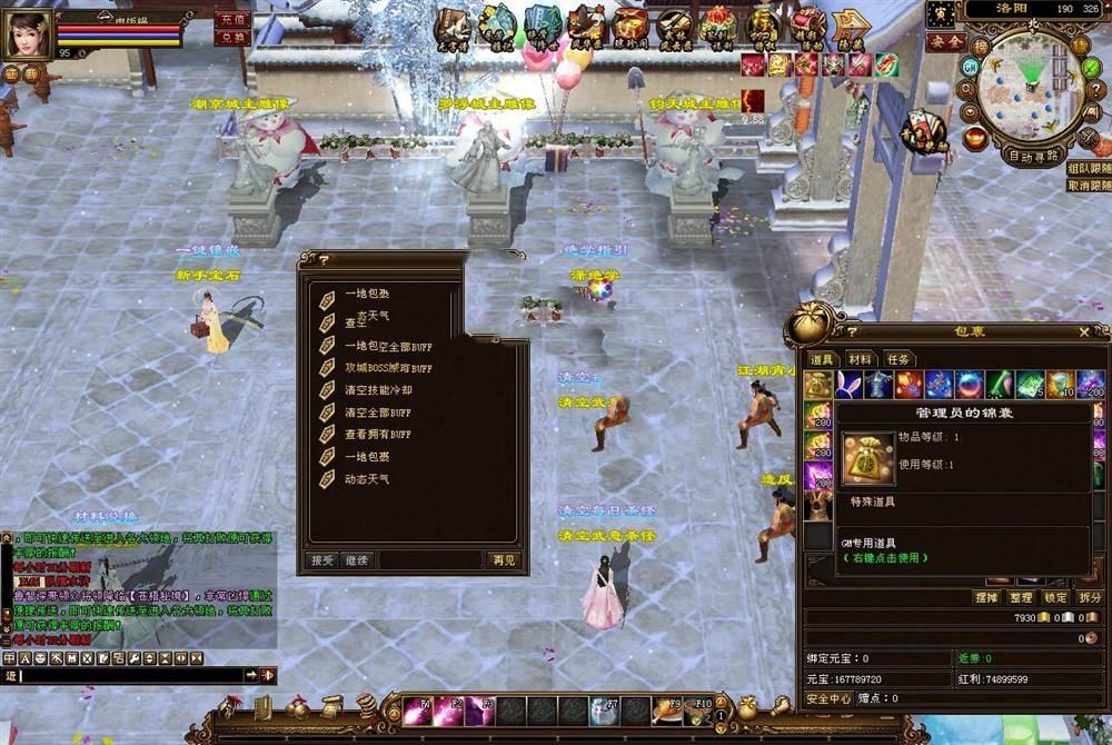 添加使用GM功能账号1,2,3, 4, 5, 6 ,7,这几个账号进入后,GM工具发送管理员锦囊,都可以游戏内使用 “管理员锦囊”内置GM