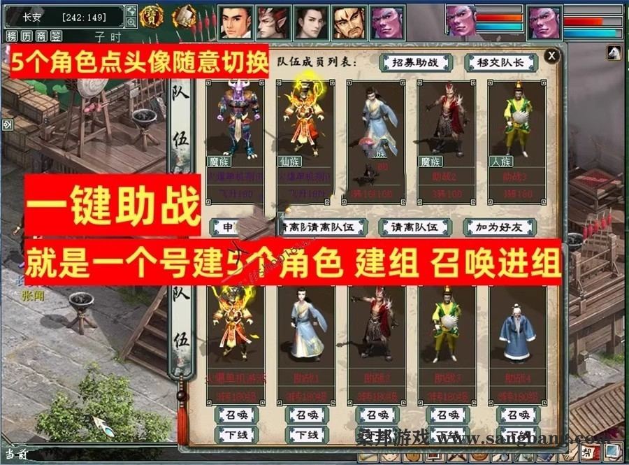 特色玩法:助战功能,一键组队召唤账号角色,无需多开,随意切换角色。
